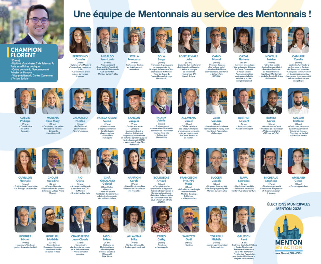 Menton en Action, c’est avant tout une équipe de femmes et d’hommes engagés, issus d’horizons différents mais réunis par une même volonté : agir pour l’avenir de Menton.